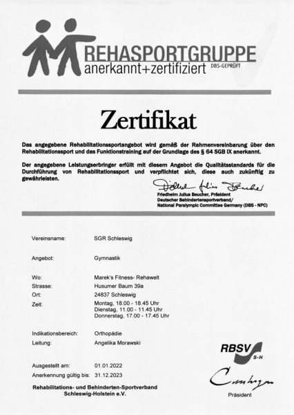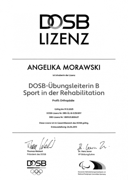 Angelika Morawski hat nach ihrer abgeschlossenen Ausbildung zur Fitness-, Rücken- und Wirbelsäulentrainerin an der Internationalen Fitnessakademie, ihre Ausbildung beim Rehabilitations- und Behindertensportverband RBSV S-H erweitert zur Fachübungsleiterin für Rehabilitationssport – Bereich Orthopädie nach den Richtlinien des Deutschen Olympischen Sportbundes (DOSB).